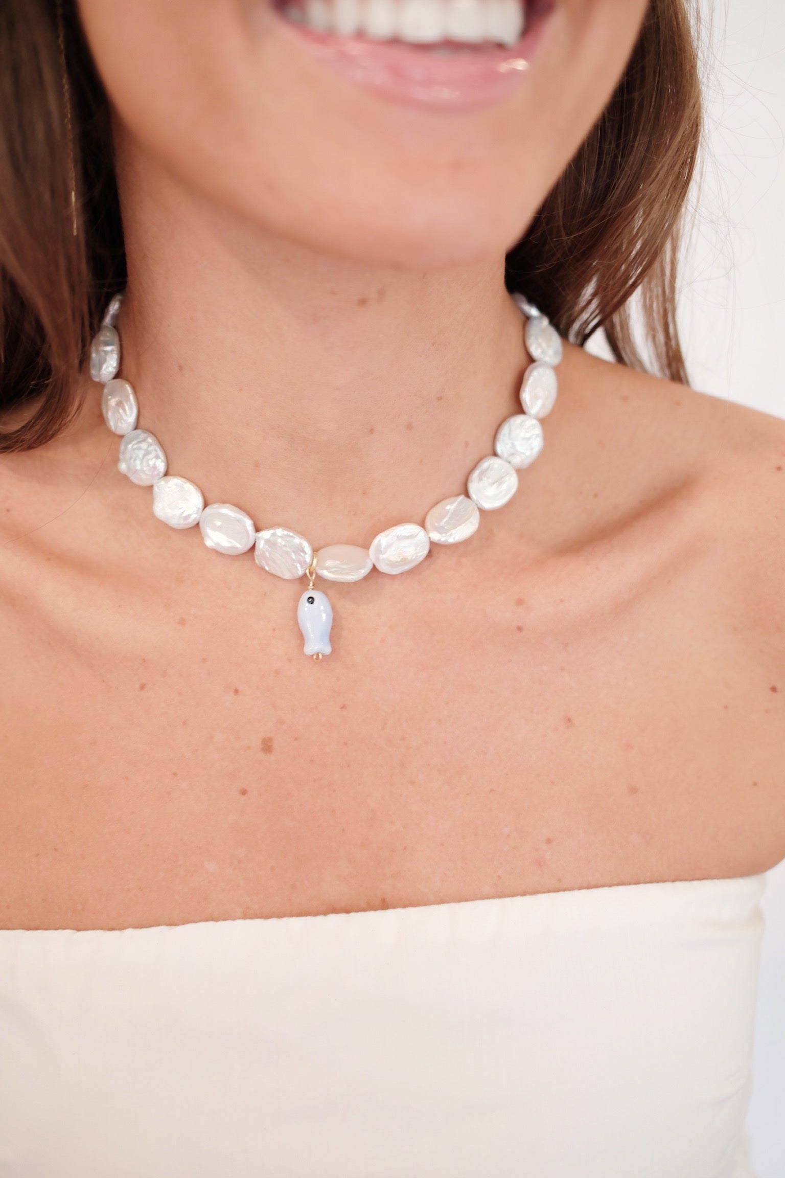 Unit price perOur best seller, The Coco, but with a new and fun twist! 14” of pearls with a fun fish charm! Blue color may vary. 14” with 2” extender.