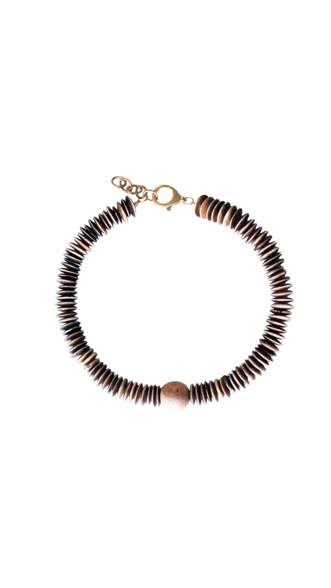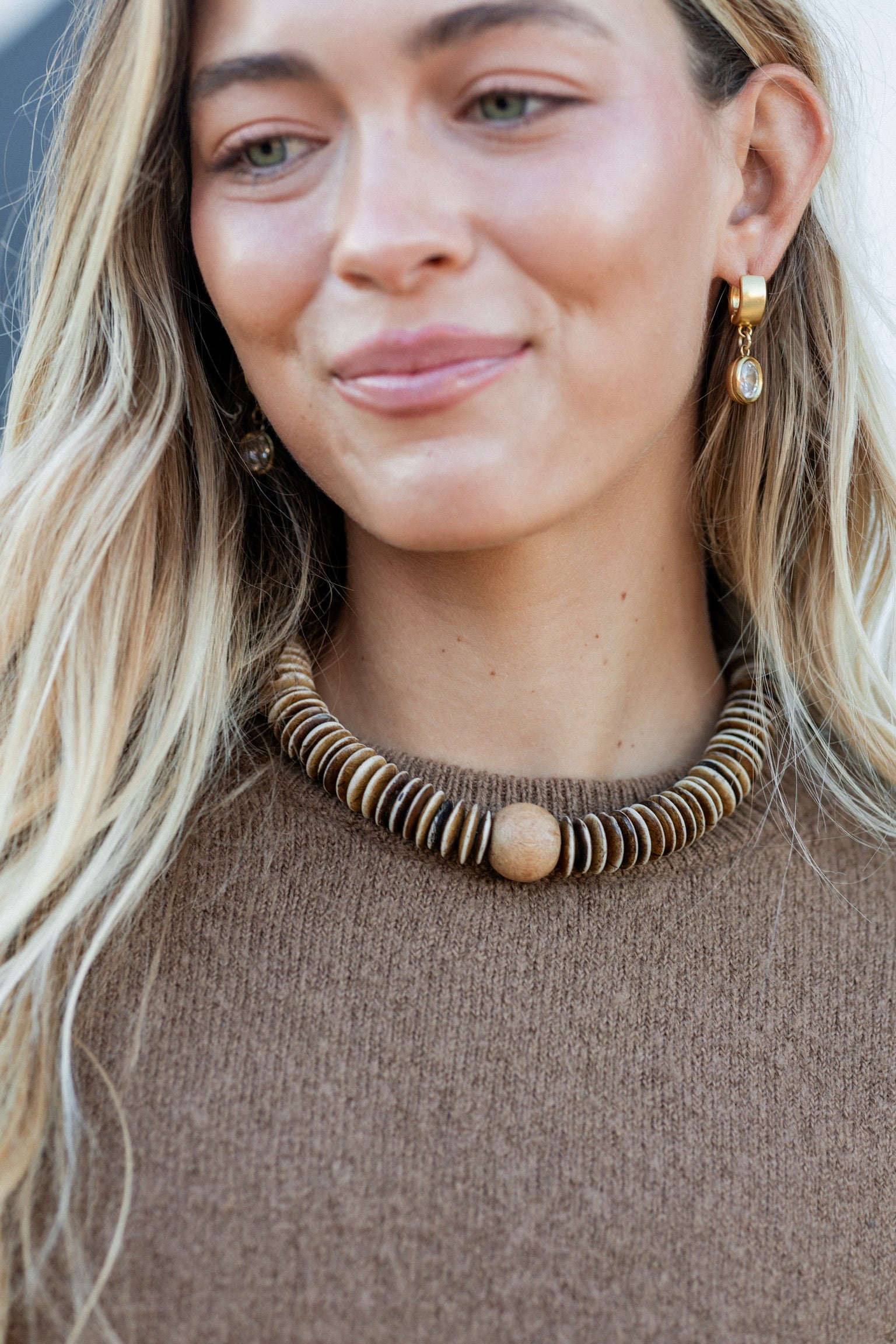 Unit price perBold brown statement piece perfect for every outfit !!! 16” of large brown colored disc beads with a unique wooden center