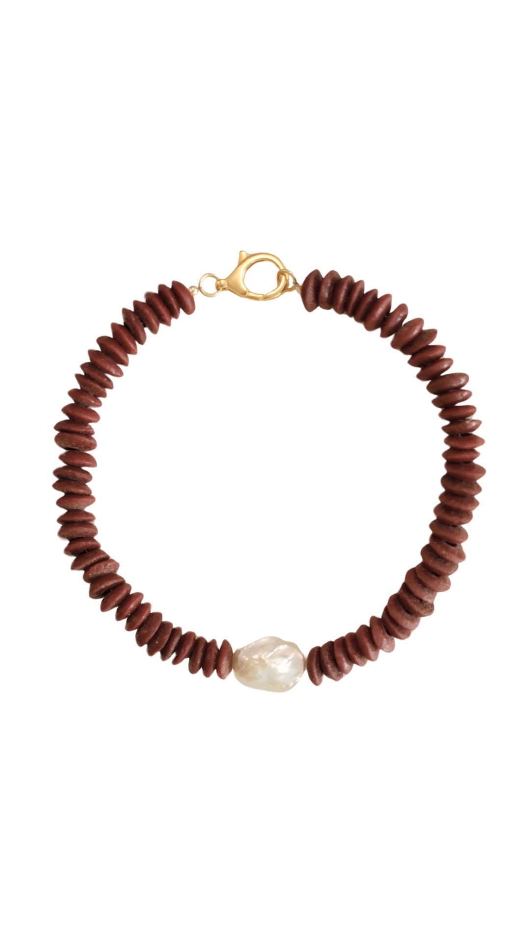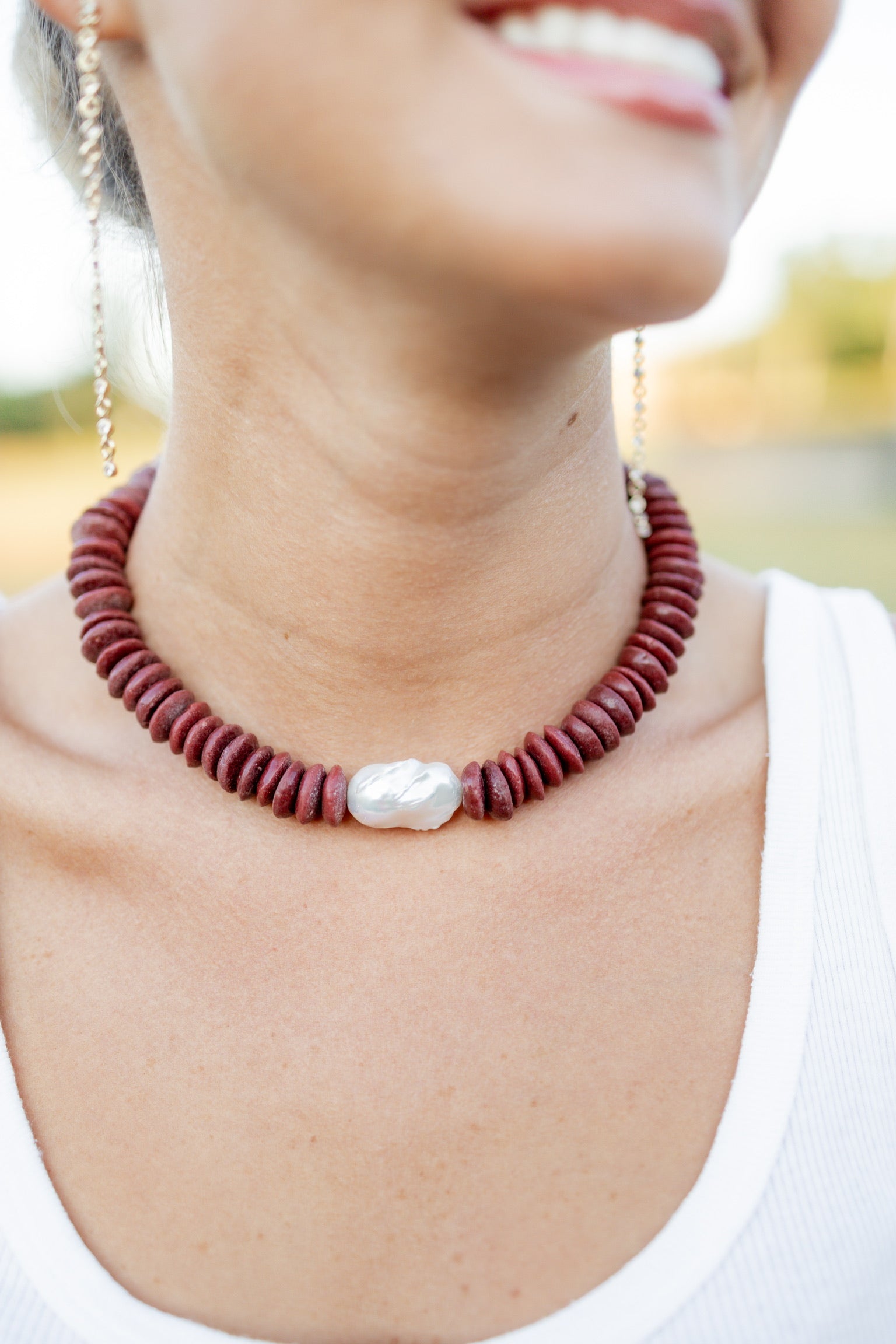 Unit price perOur ashanti saucer beads in a deep maroon color with a fresh heater pearl in the center! 15” with 2” extender