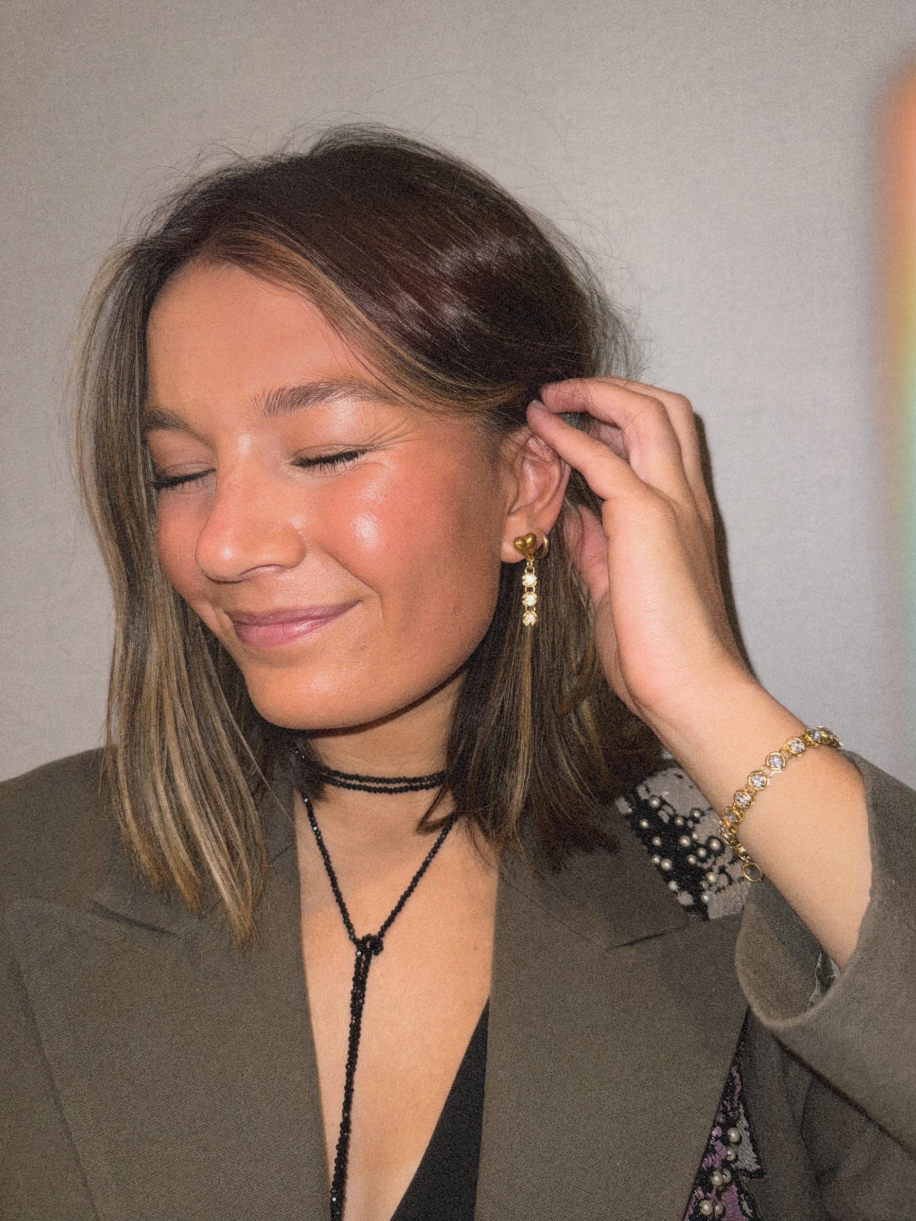 Unit price perStunning gold heart stud with diamond drops hanging from them. Perfect for everyday wear or for special occasions!