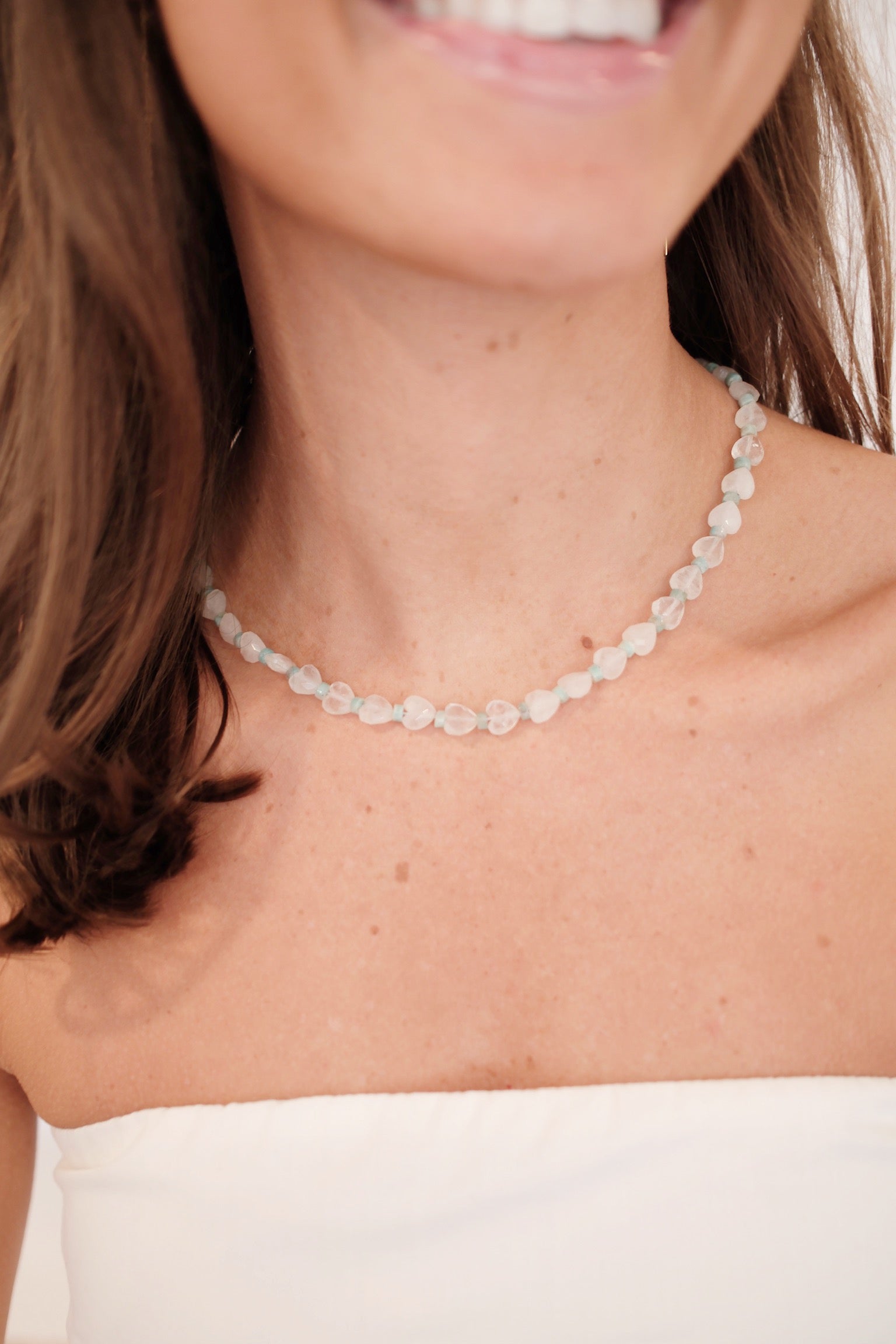 A simple and unique necklace made of iridescent hearts mixed with our light aqua beads! Designed to be paired with our other AG pieces! 15” with 2” extender