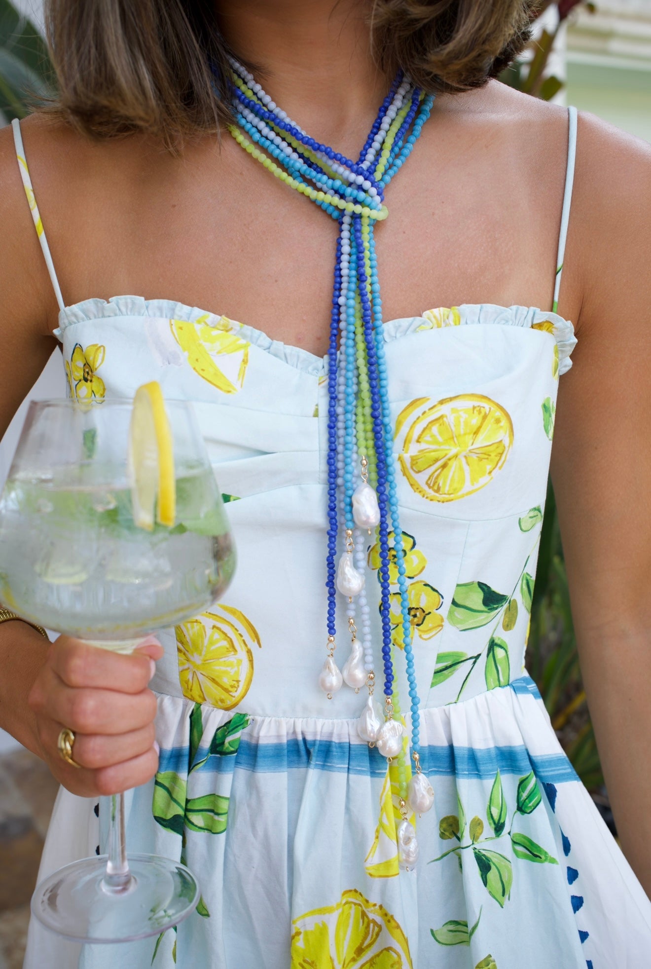 Unit price perOur best selling design back in a new color! The Kelly Wrap Blueberry has gorgeous bright blue glass beads with two freshwater baroque pearls at the end. 4' 8" long and can be worn so many ways! Have fun styling!