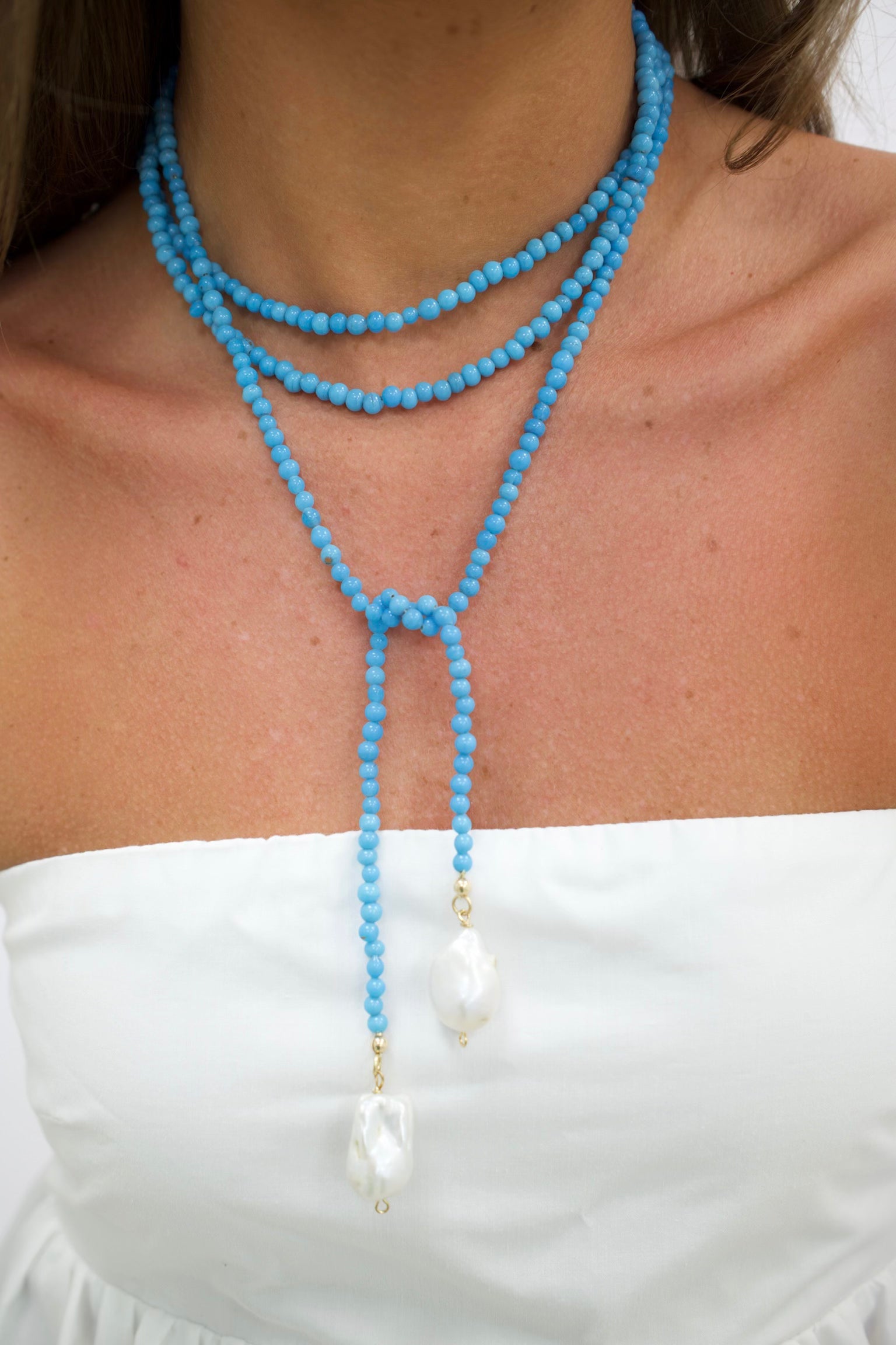 Unit price perOur best selling design back in a new color! The Kelly Wrap Juneberry has gorgeous turquoise blue glass beads with two freshwater baroque pearls at the end. 4' 8" long and can be worn so many ways! Have fun styling!