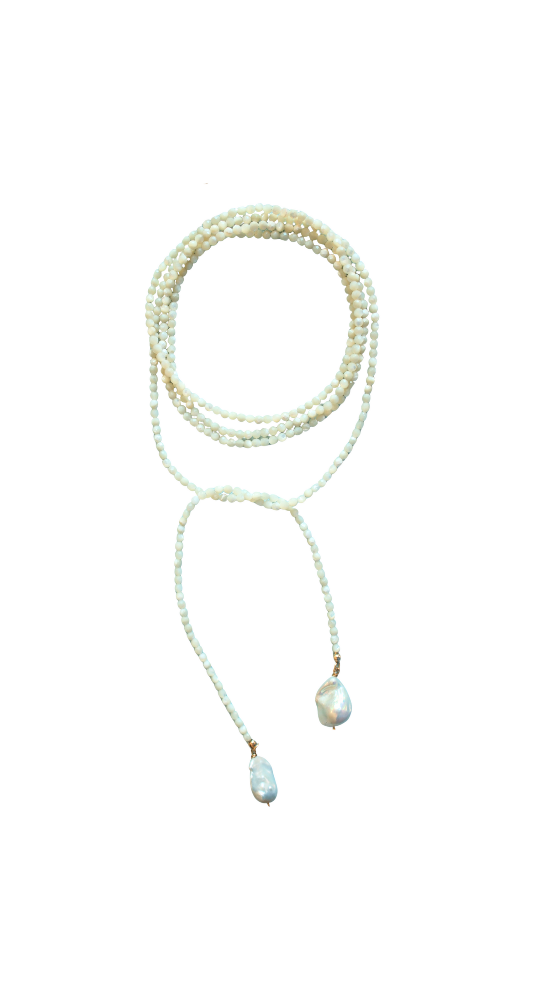 Unit price perOur best selling design back in a new color! Featuring gorgeous white colored beads with two freshwater baroque pearls at the end. 4' 8" long and can be worn so many ways! Have fun styling!