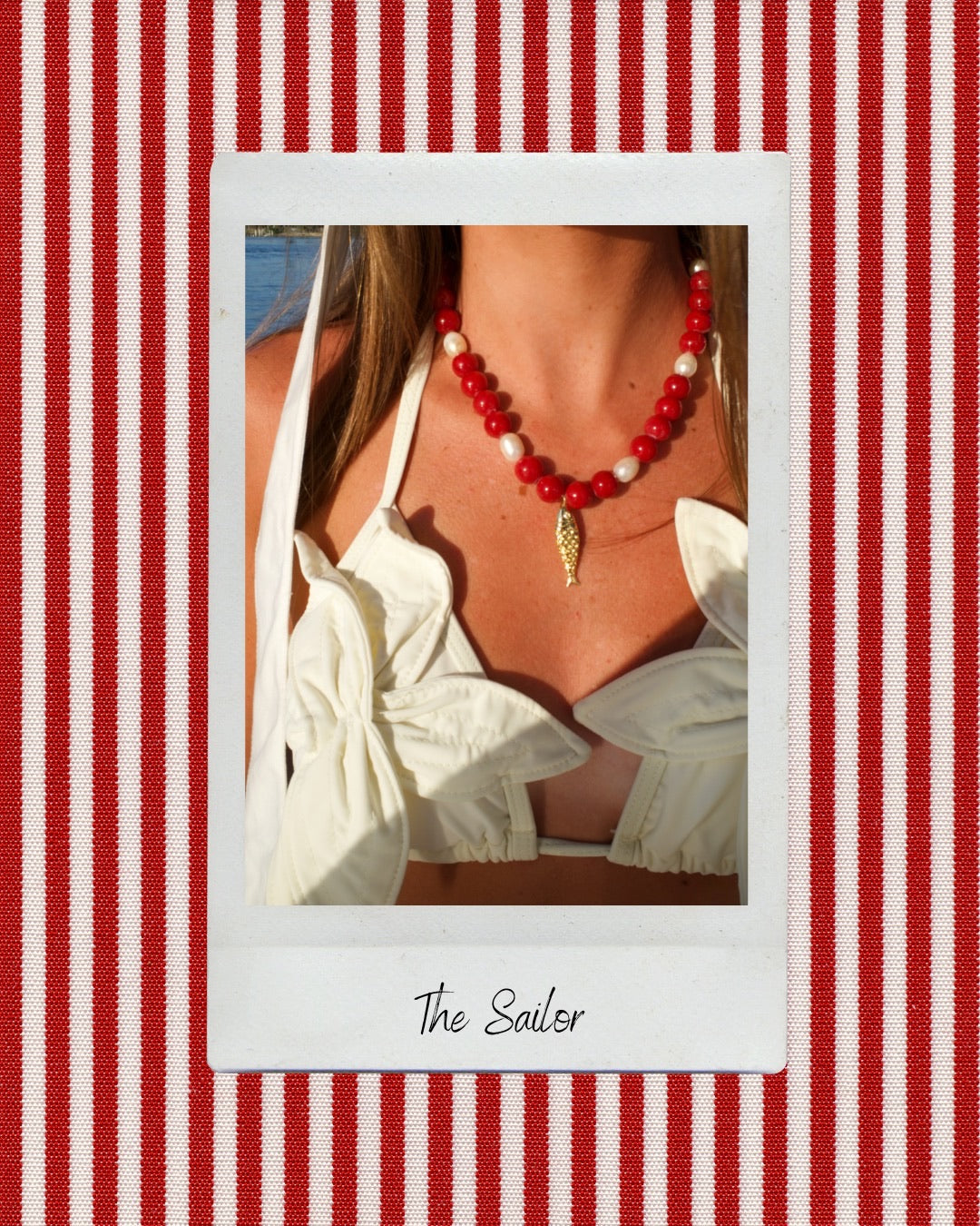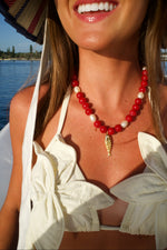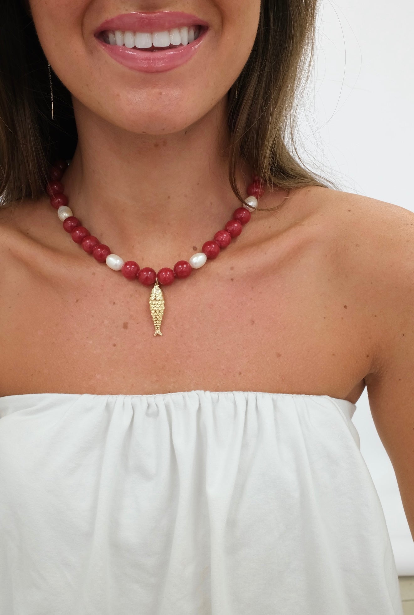 Unit price per16” of ruby red jade beads with freshwater pearls mixed in and a unique fish charm! 2” extender