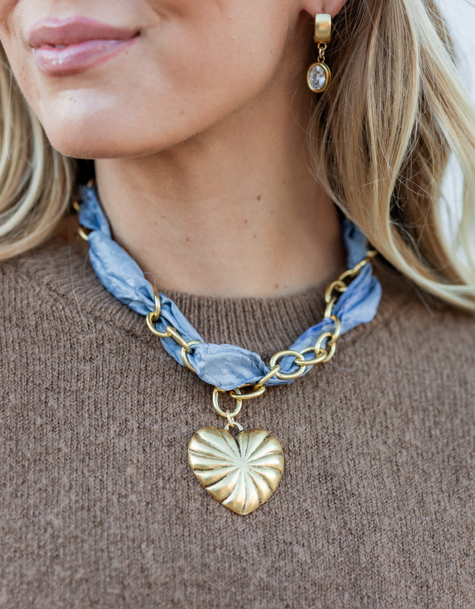 Unit price perWhimsical blue fabric woven into our 16” 12k antique gold large chain ! Completed with our new gold starburst heart pendant !